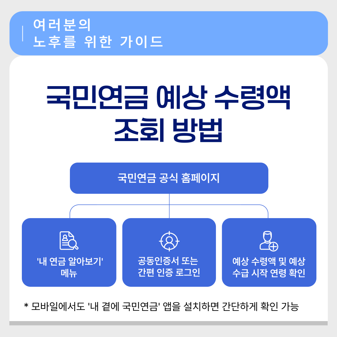 📱 모바일 앱을 이용하면 더 편리합니다. '내 곁에 국민연금' 앱을 설치하고 로그인하여 바로 예상 수령액을 확인할 수 있습니다.