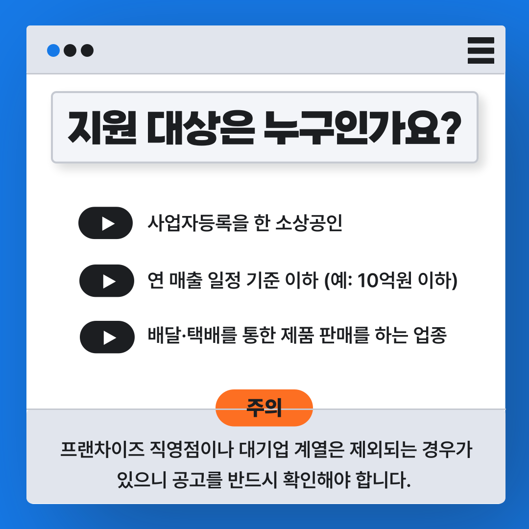 ⚠️ 단, 프랜차이즈 직영점이나 대기업 계열은 제외되는 경우가 많으니 공고를 반드시 확인해야 합니다.